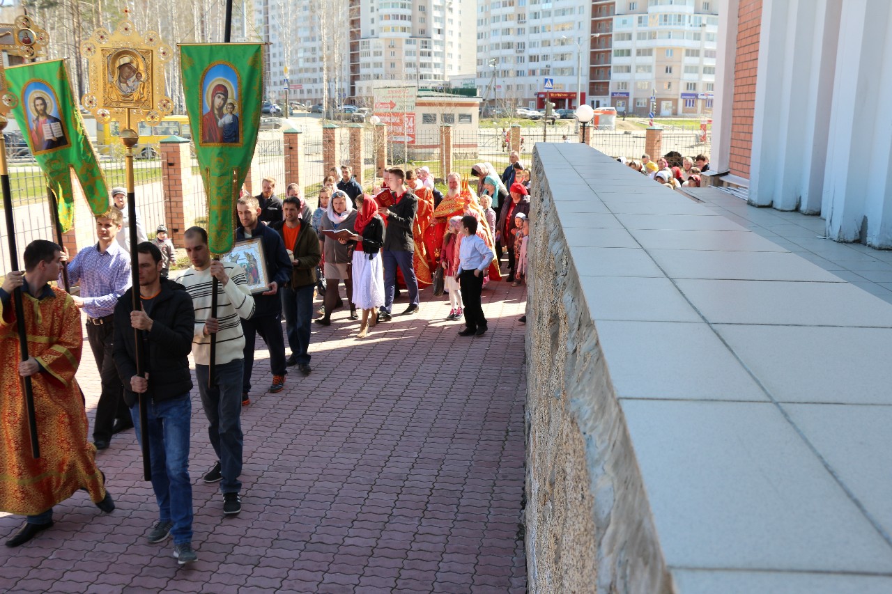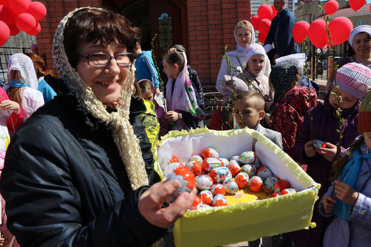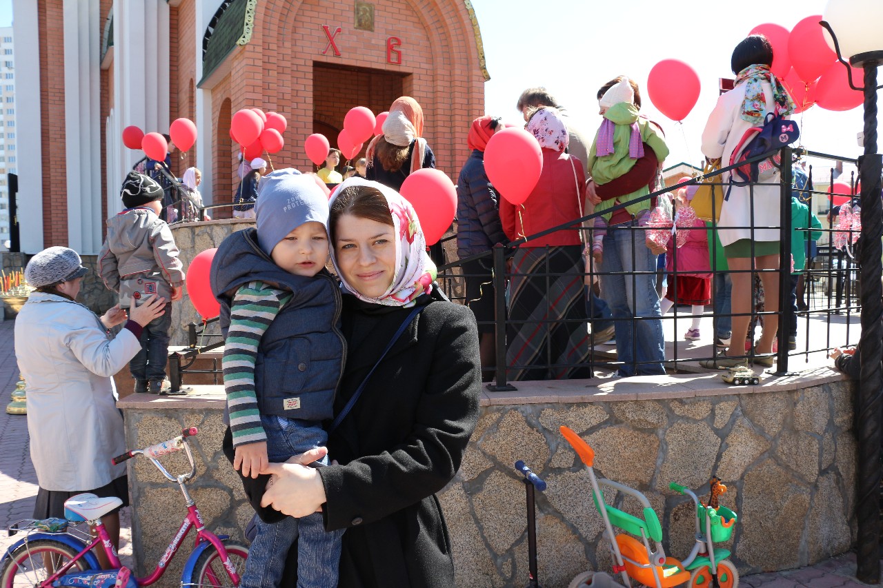 В день Светлого Христова Воскресения по окончании Божественной литургии паперть храма равноапостольного князя Владимира превратилась в праздничную сцену, украшенную красными воздушными шарами.