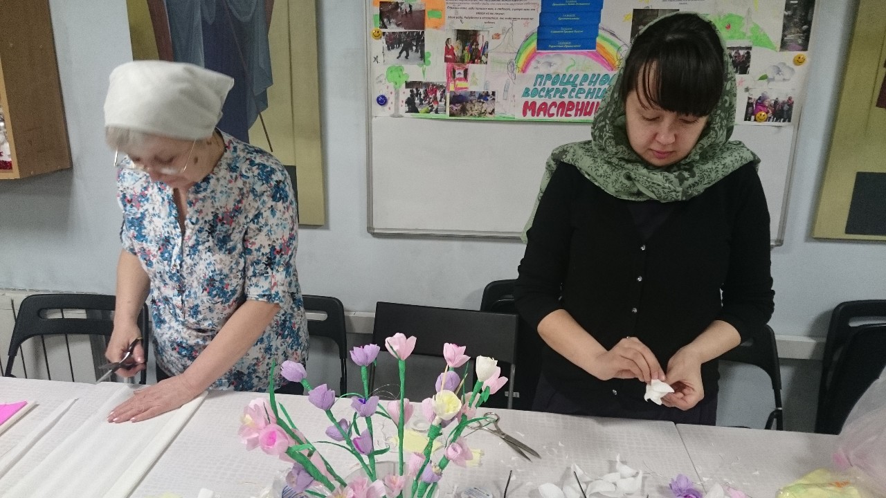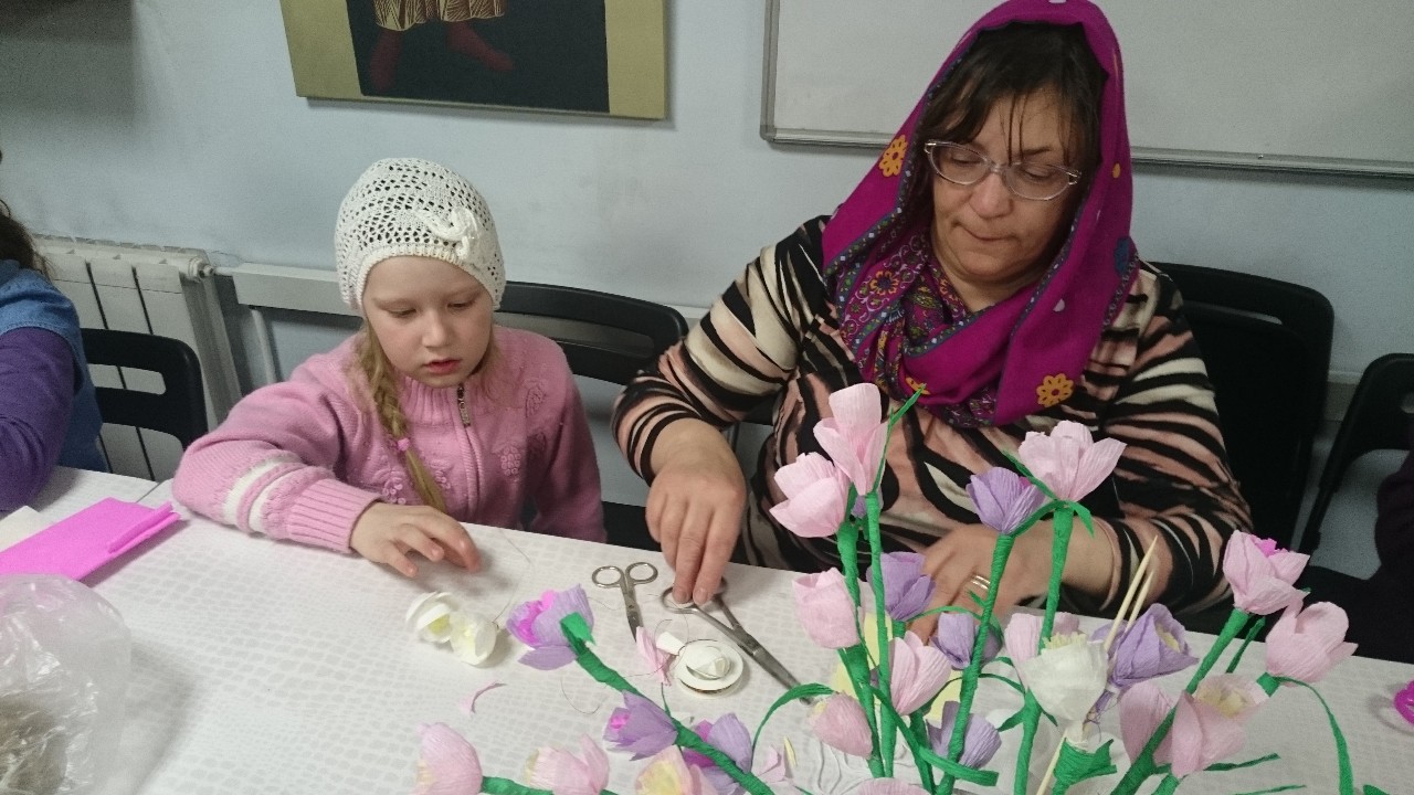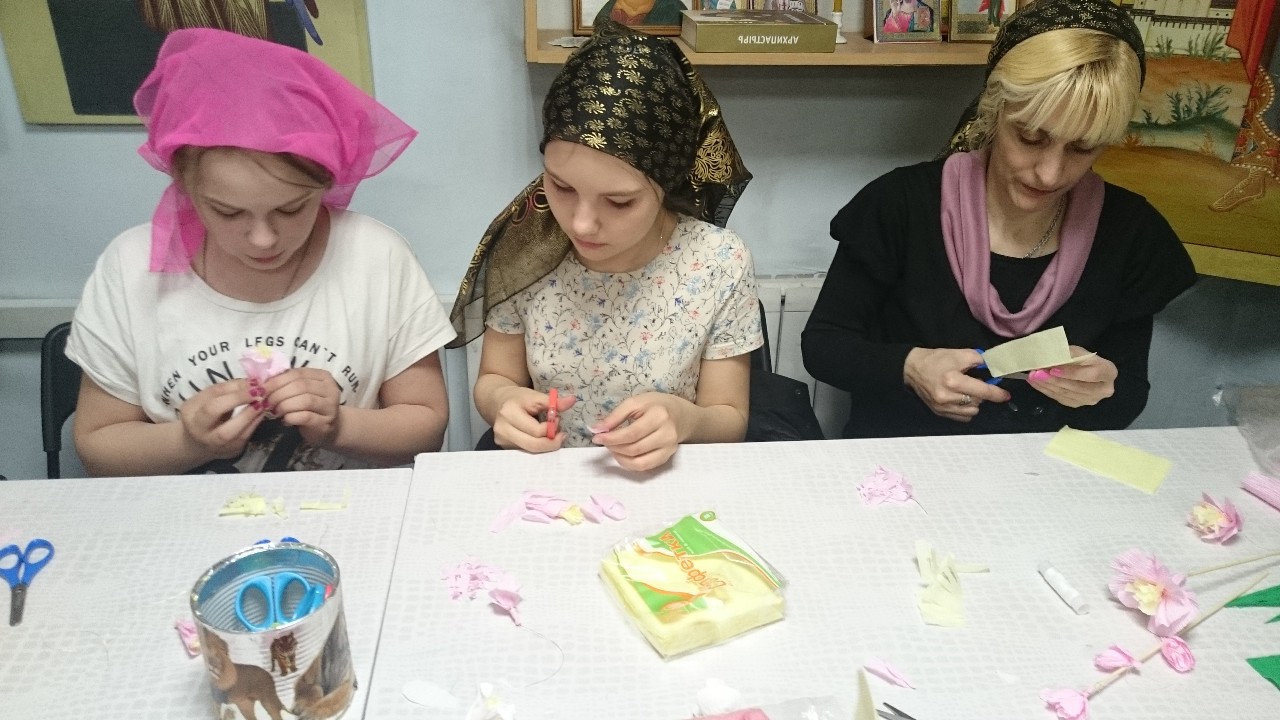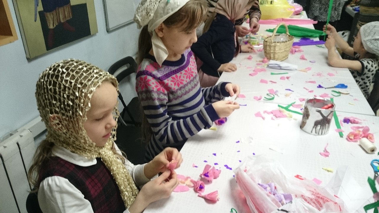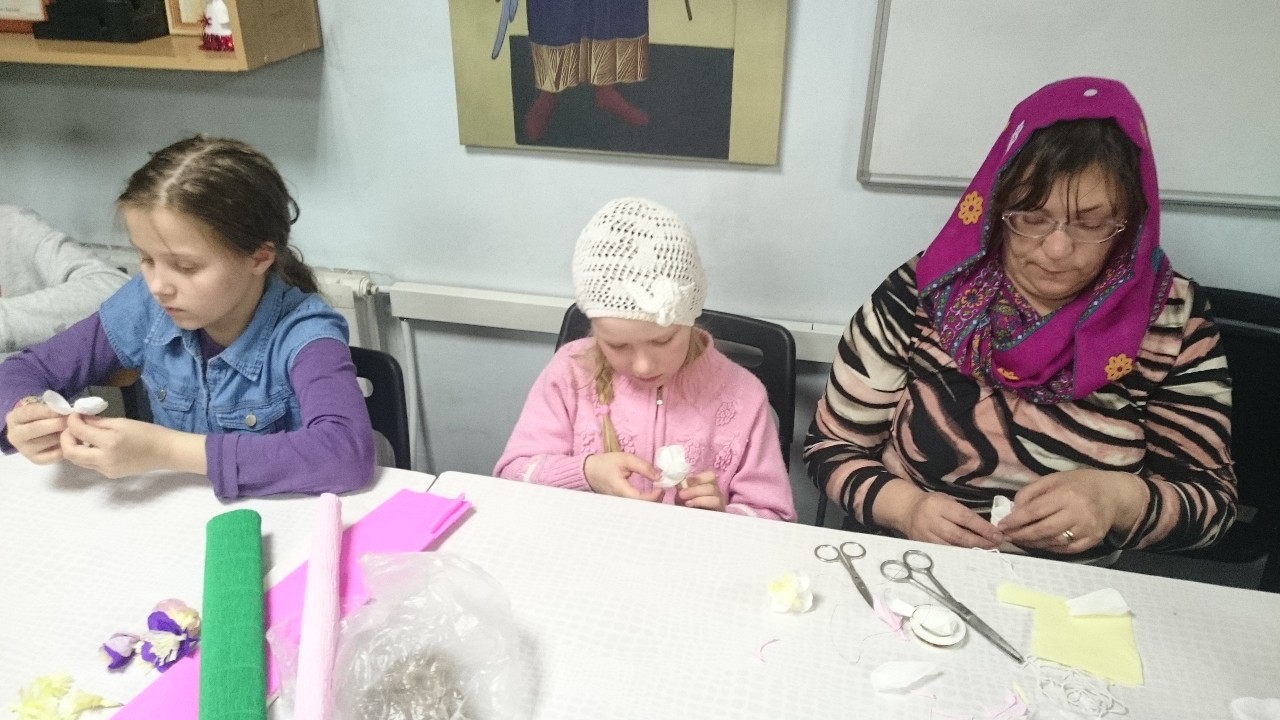 Взрослые и дети с большим интересом осваивали техники изготовления различных цветов из бумаги, которыми будут украшены веточки вербы к празднику.