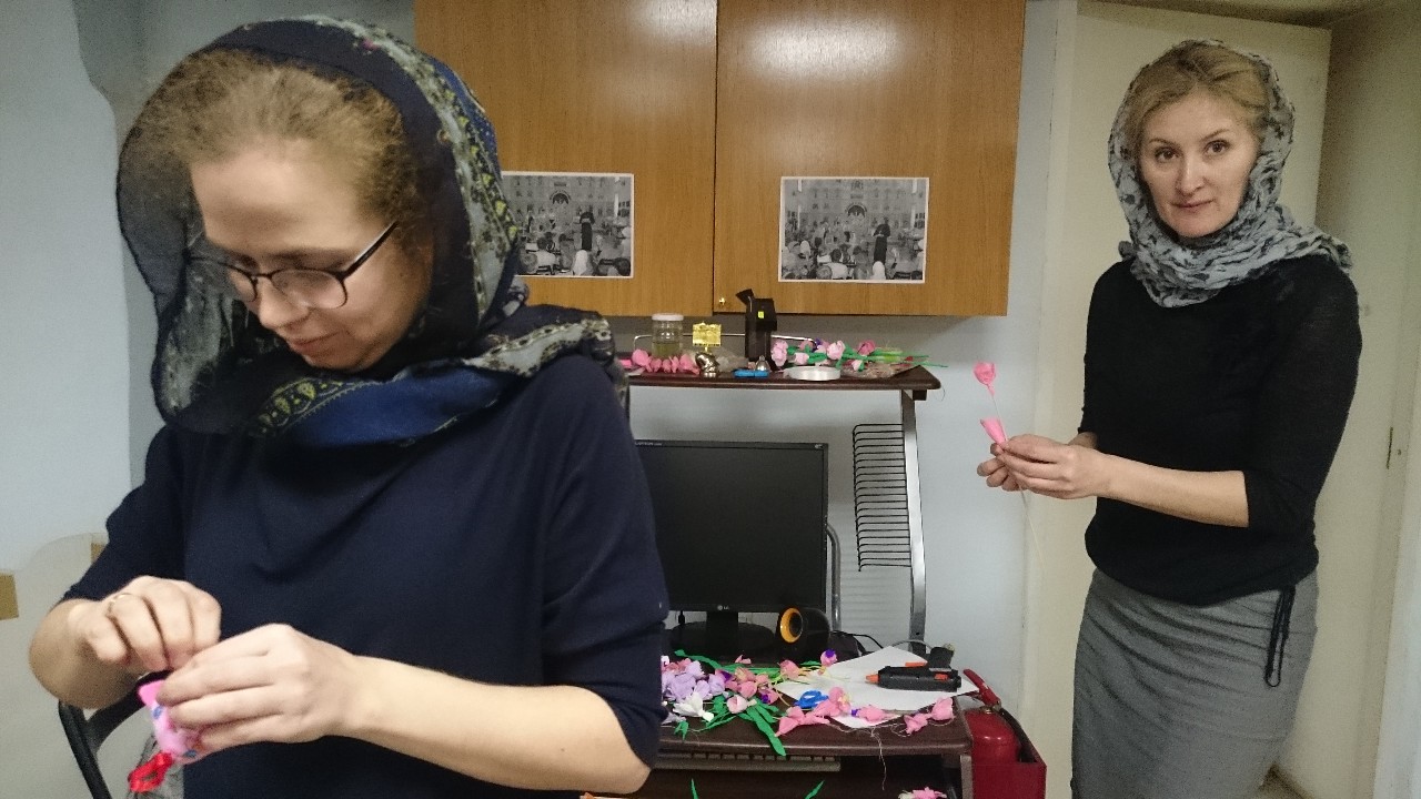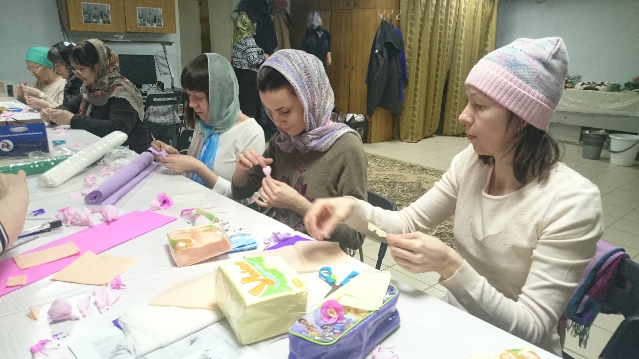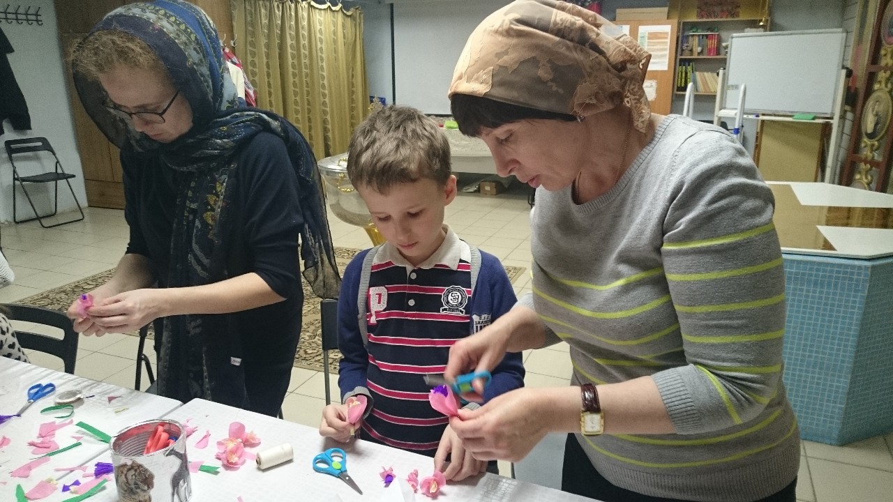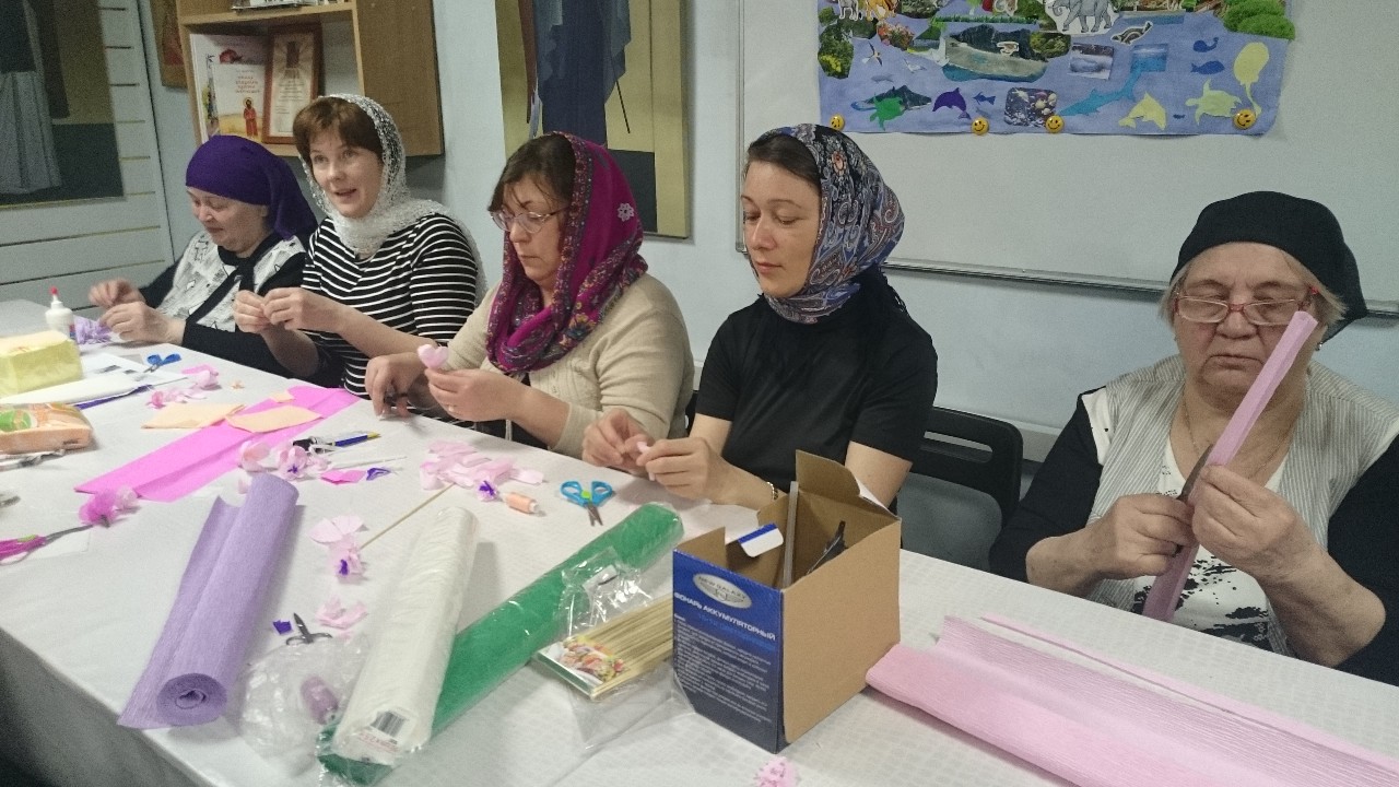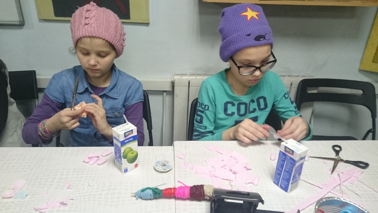 Взрослые и дети с большим интересом осваивали техники изготовления различных цветов из бумаги, которыми будут украшены веточки вербы к празднику.