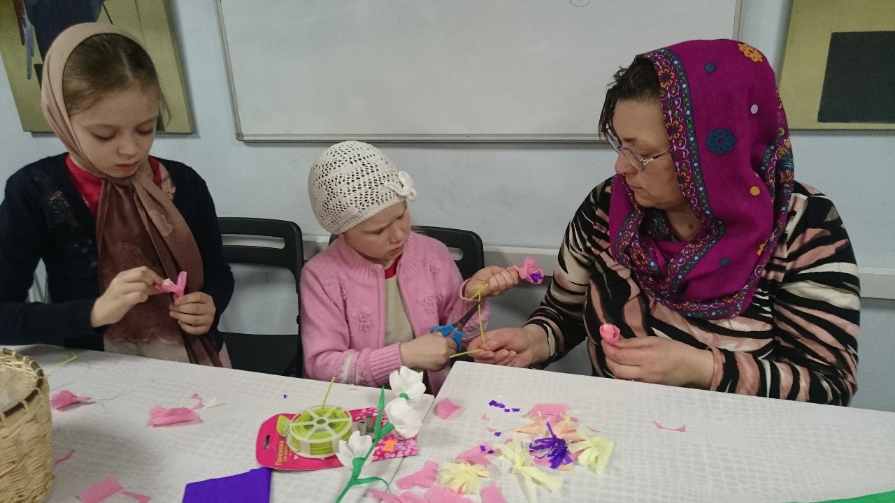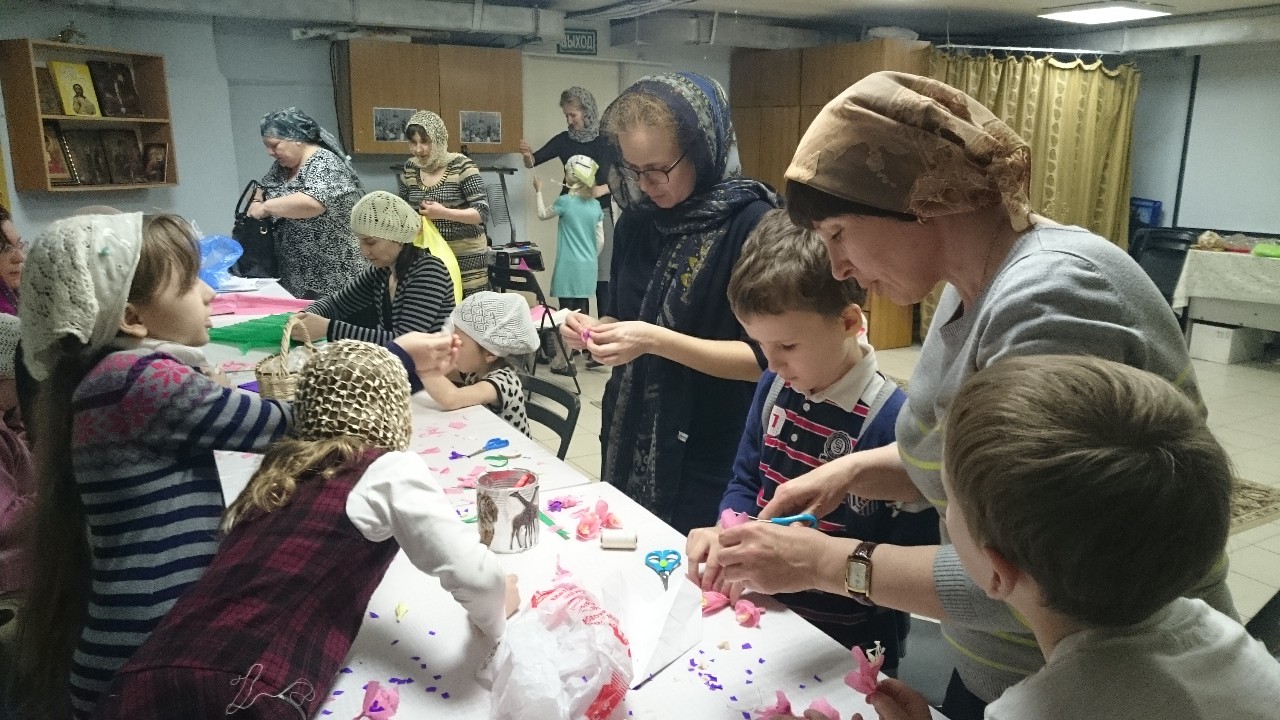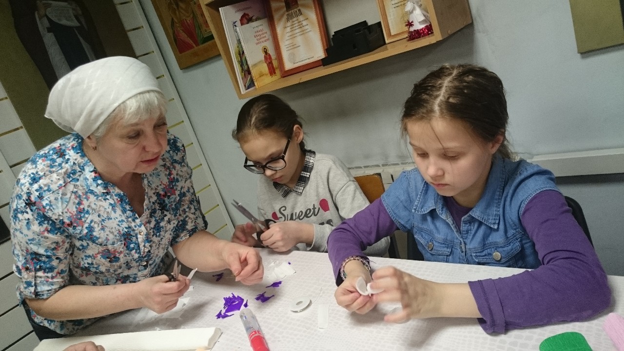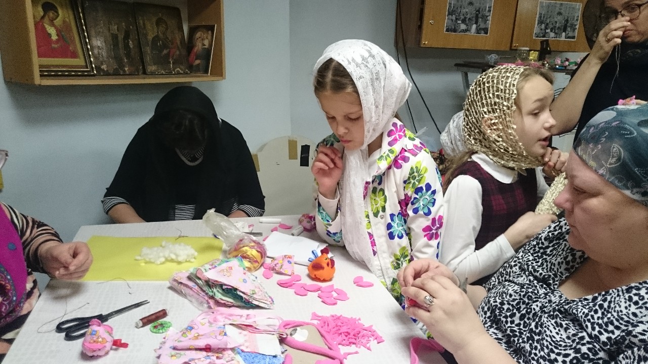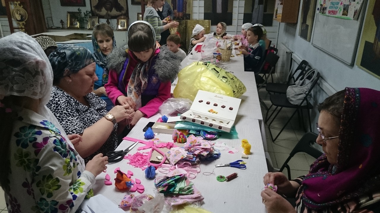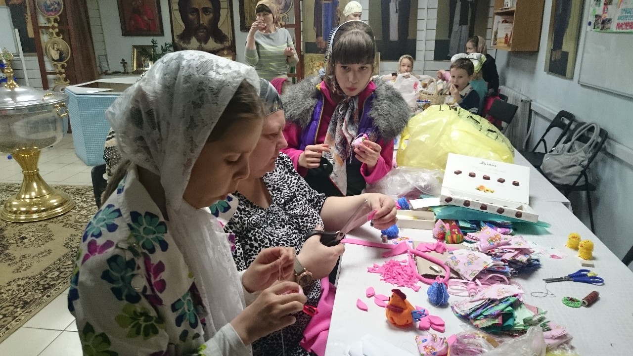 Под руководством прихожанок-мастериц старшие подростки шили разноцветных цыплят, а дети помладше склеивали ажурные корзиночки-подставки под пасхальные яйца.