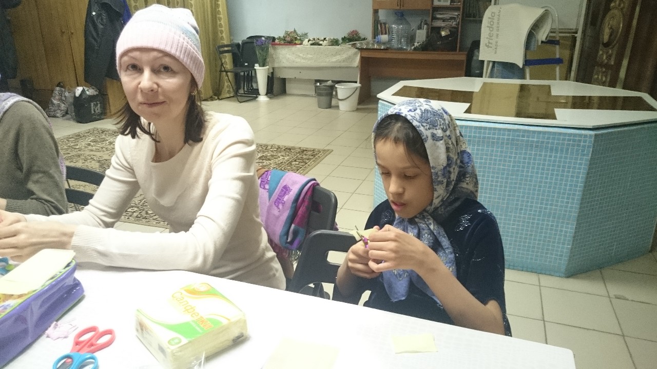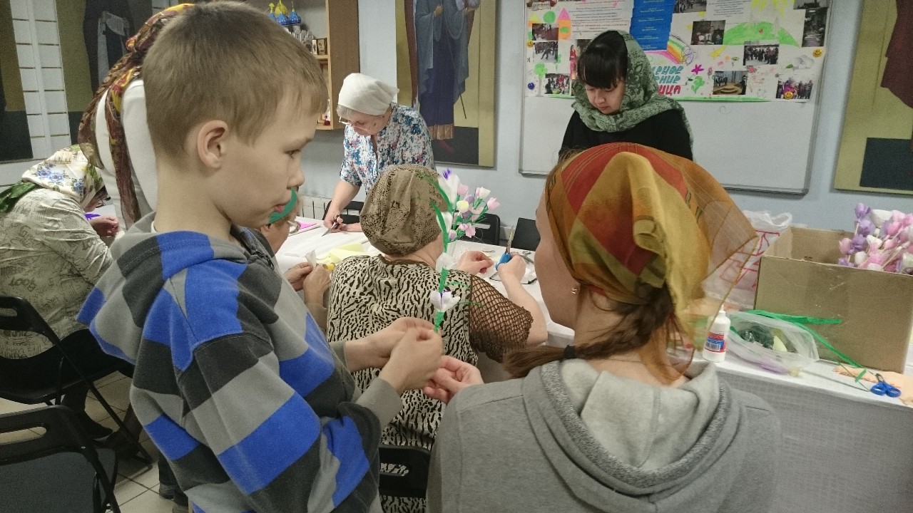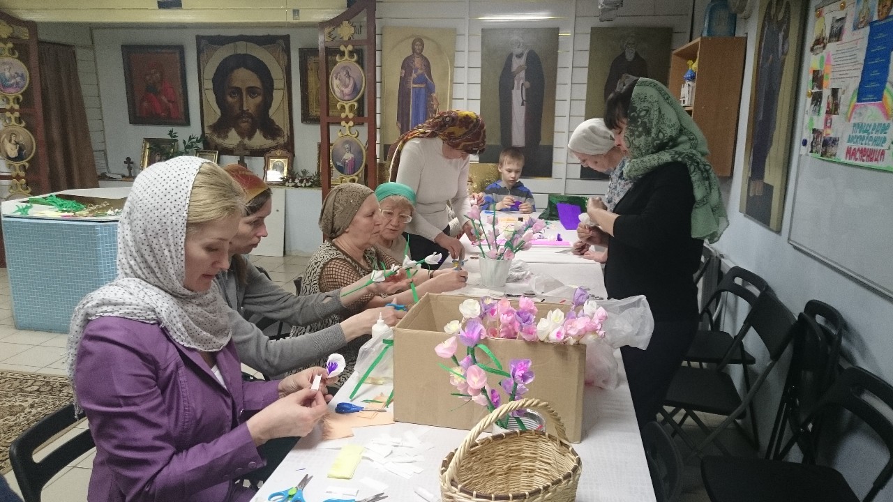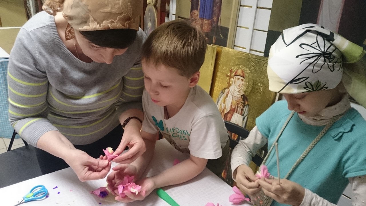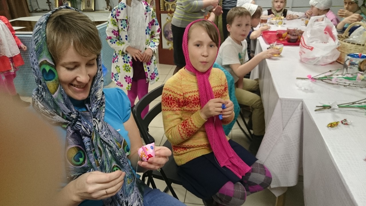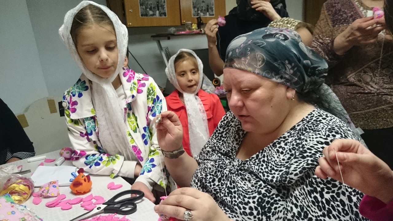 Под руководством прихожанок-мастериц старшие подростки шили разноцветных цыплят, а дети помладше склеивали ажурные корзиночки-подставки под пасхальные яйца.