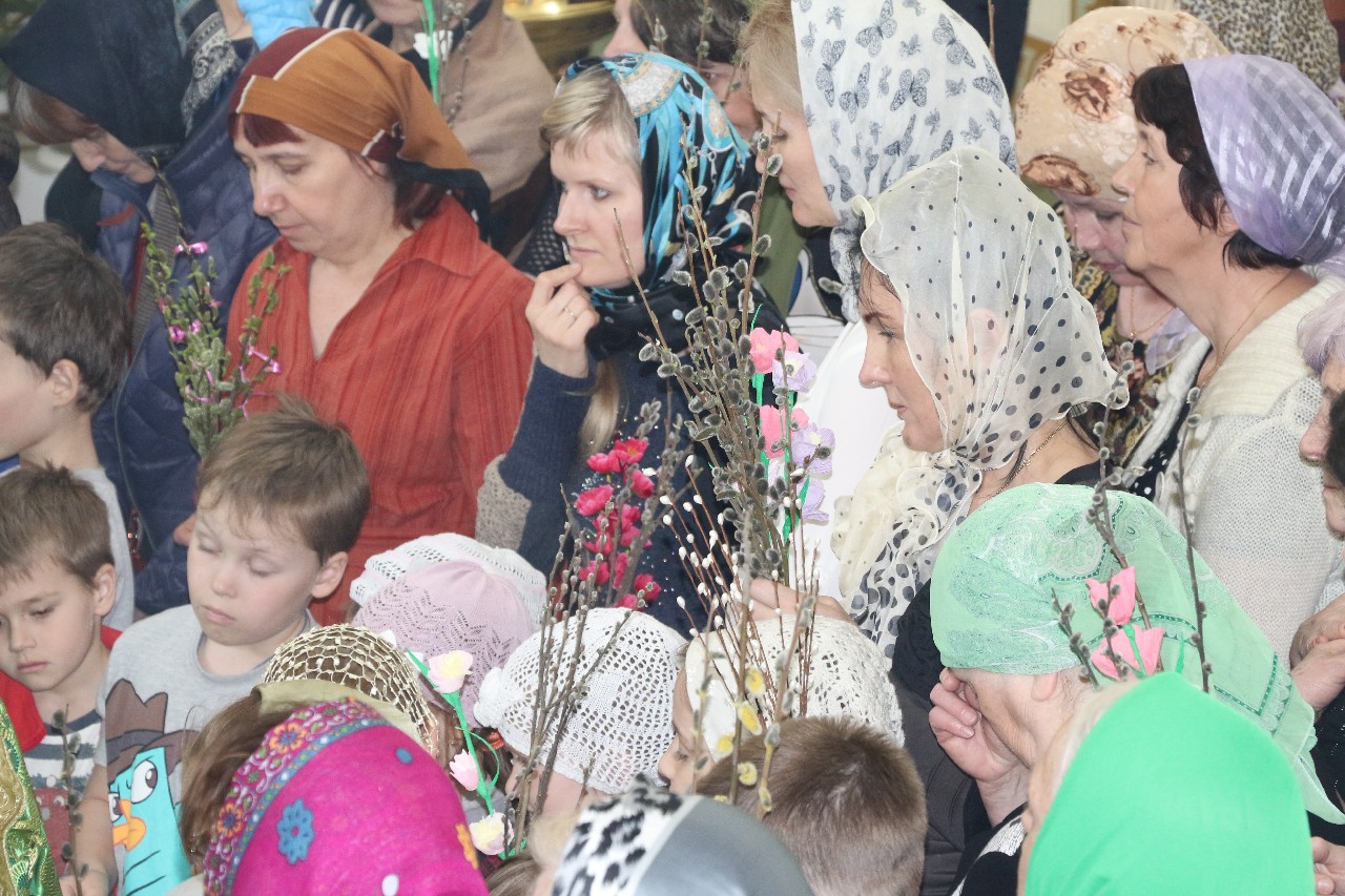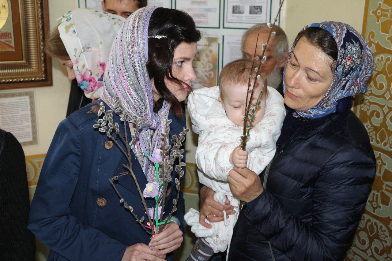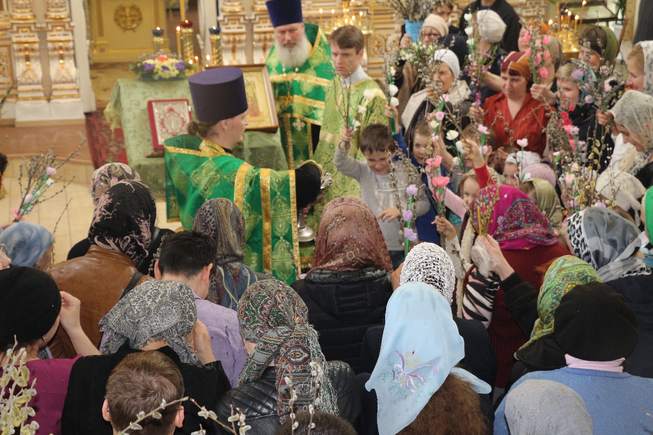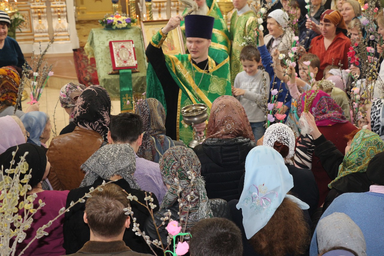 В этот праздничный день пришло множество верующих помолиться и по традиции освятить принесенные вербы.