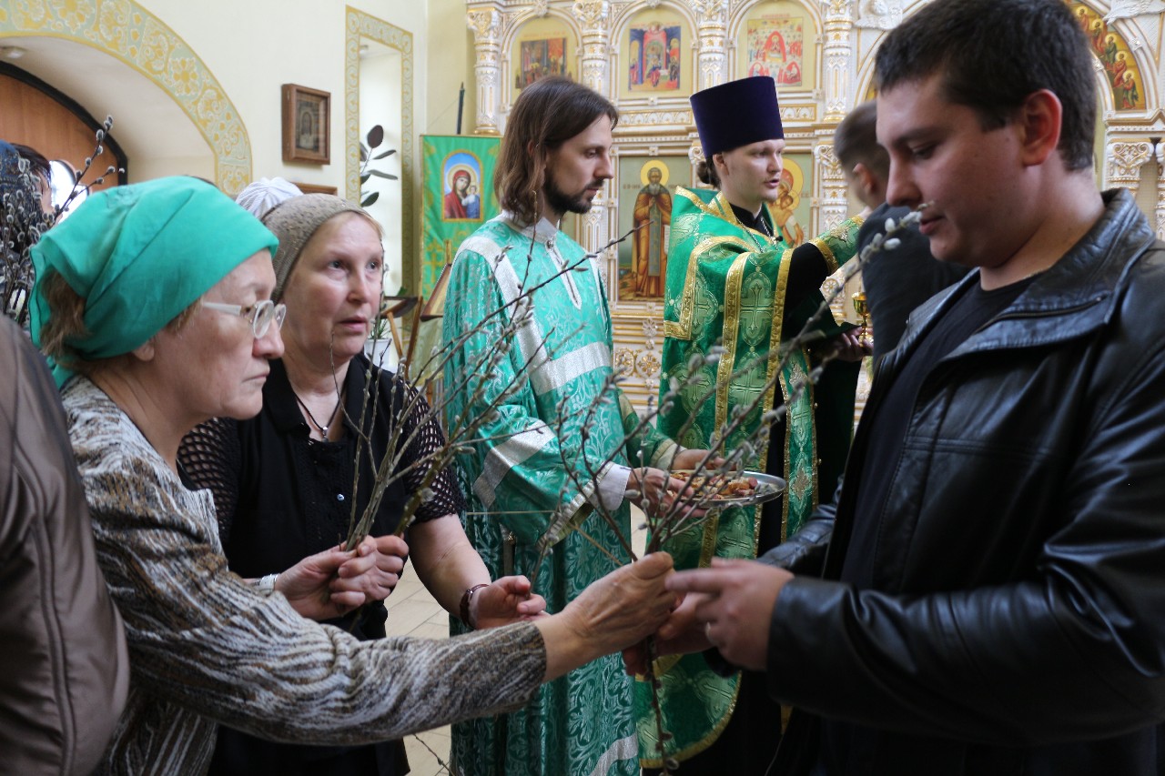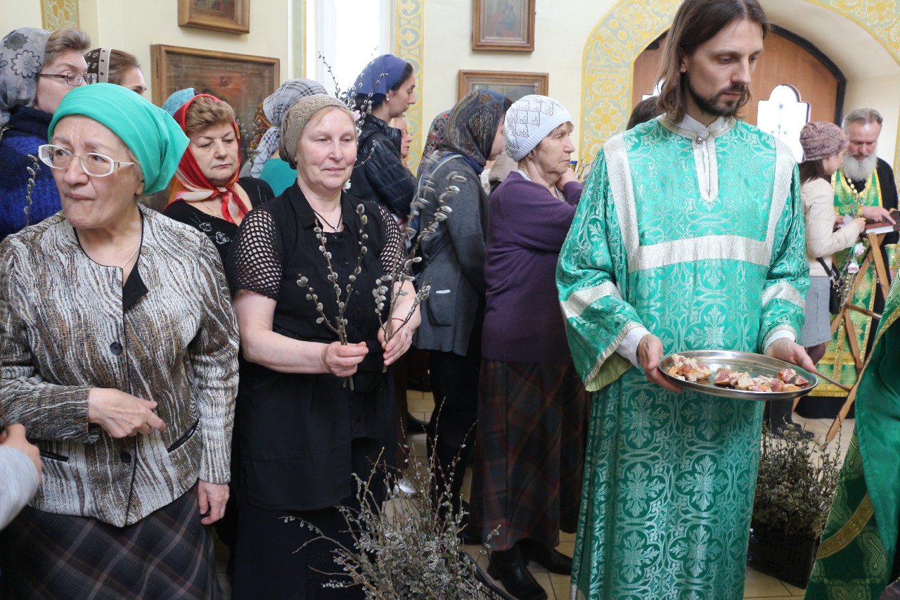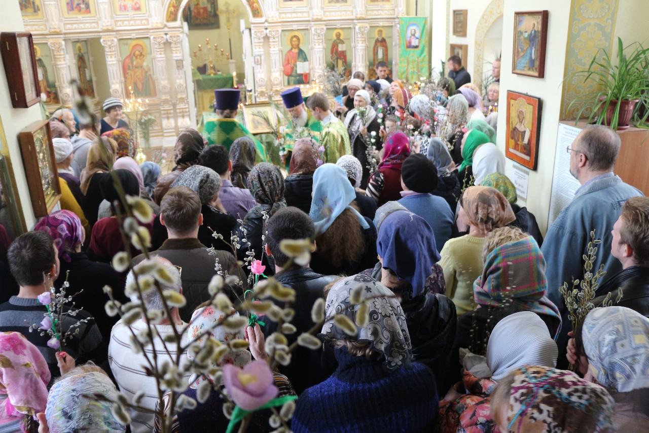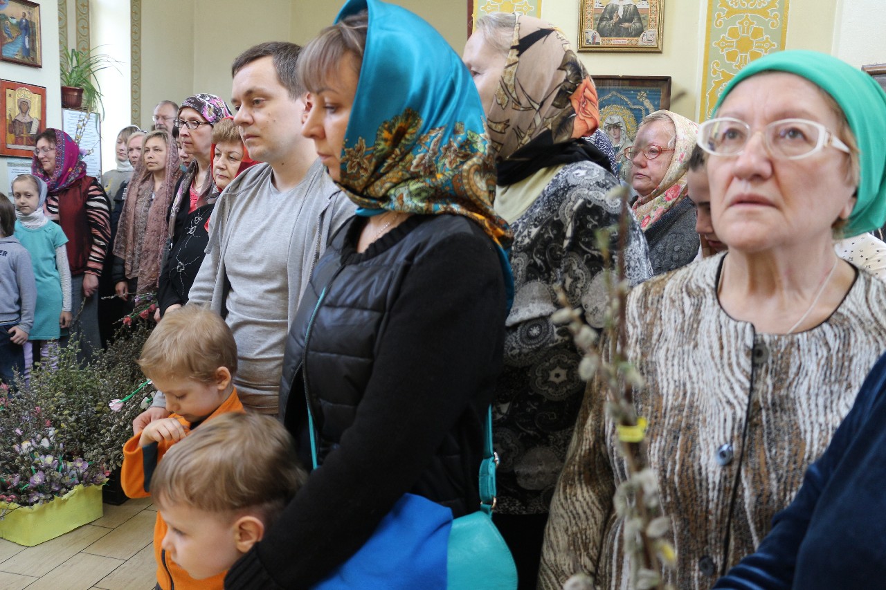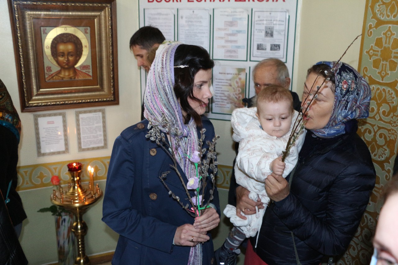 В этот праздничный день пришло множество верующих помолиться и по традиции освятить принесенные вербы.