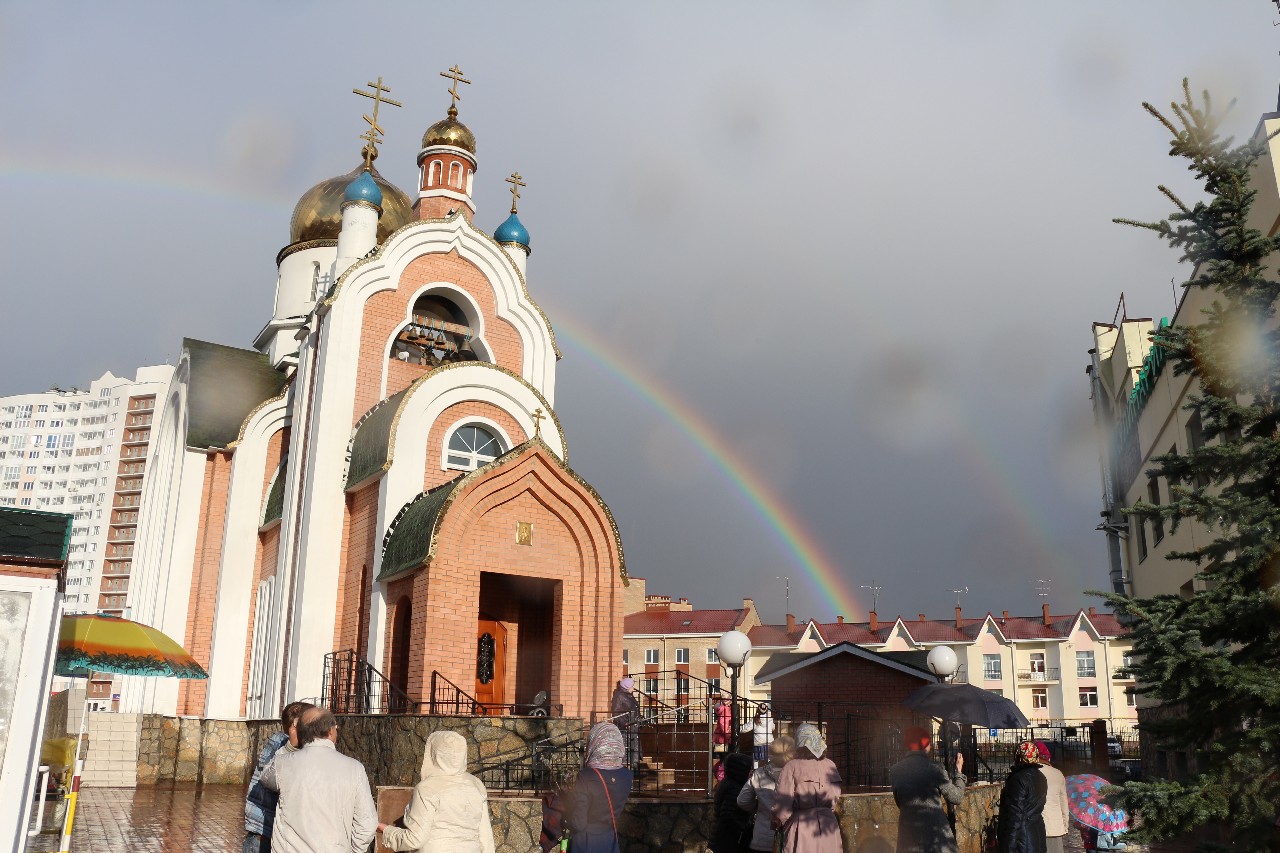 Над храмом была яркая радуга! Преломление световых солнечных лучей подарило каждому сердцу незабываемый лучик света. И сразу вспомнились строки из Ветхого Завета о даровании знамения радуги: